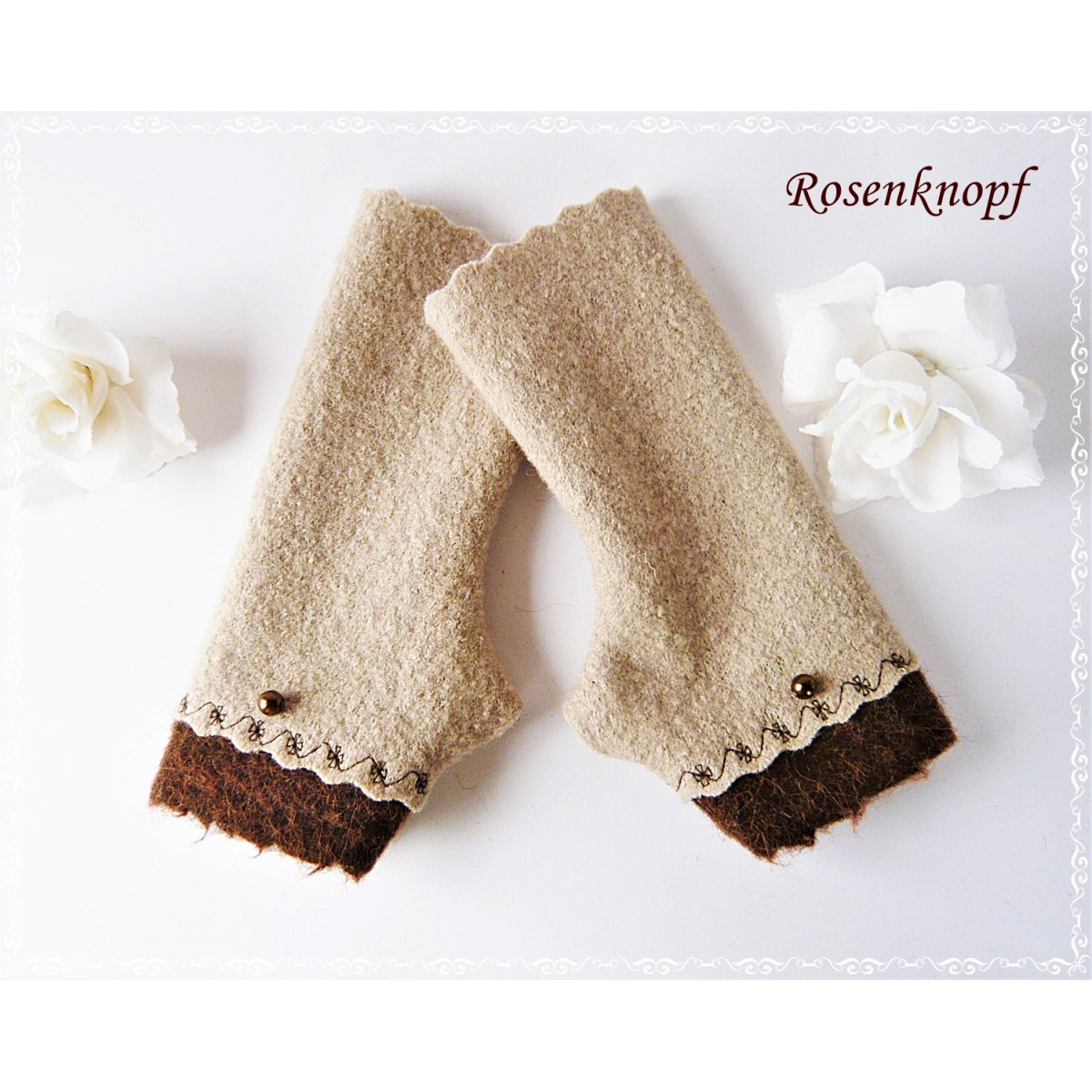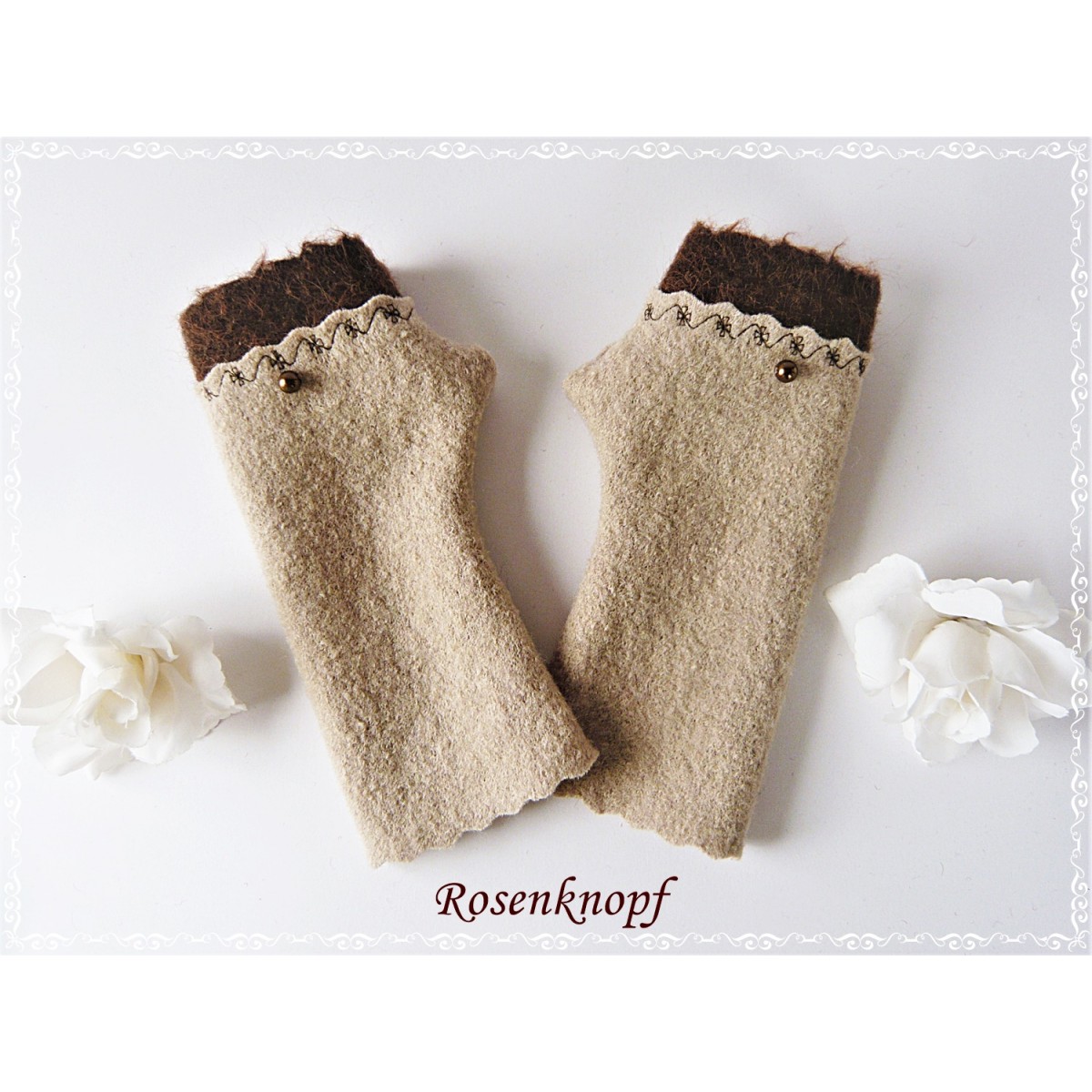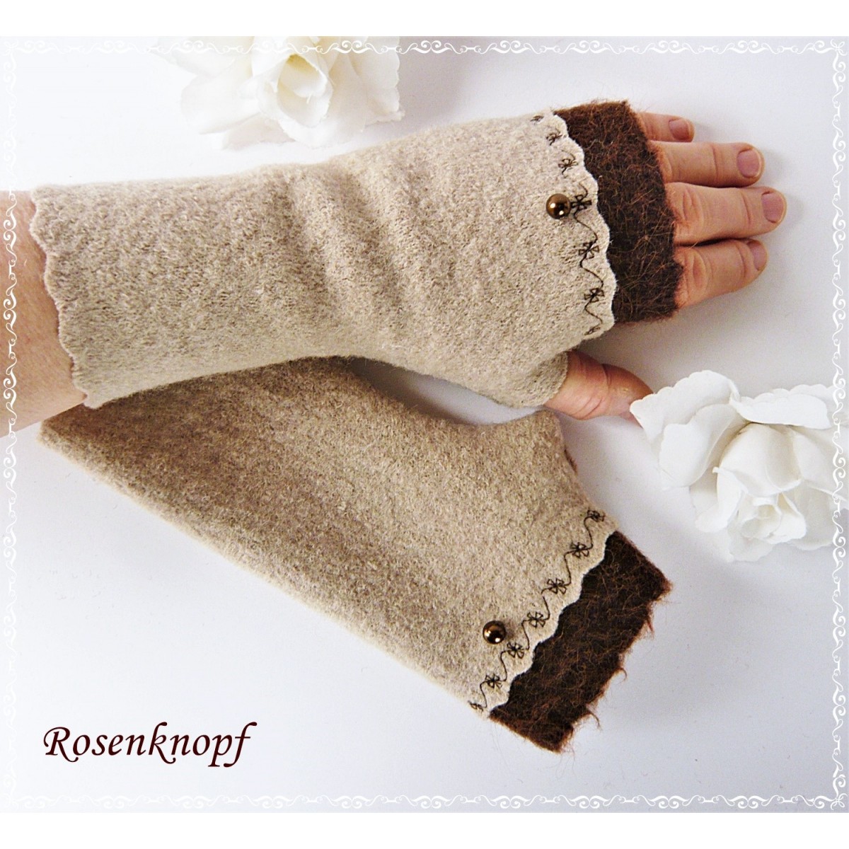lll➤ Damen Armstulpen/Pulswärmer mit Daumenloch aus Walk in Sand/Beige.