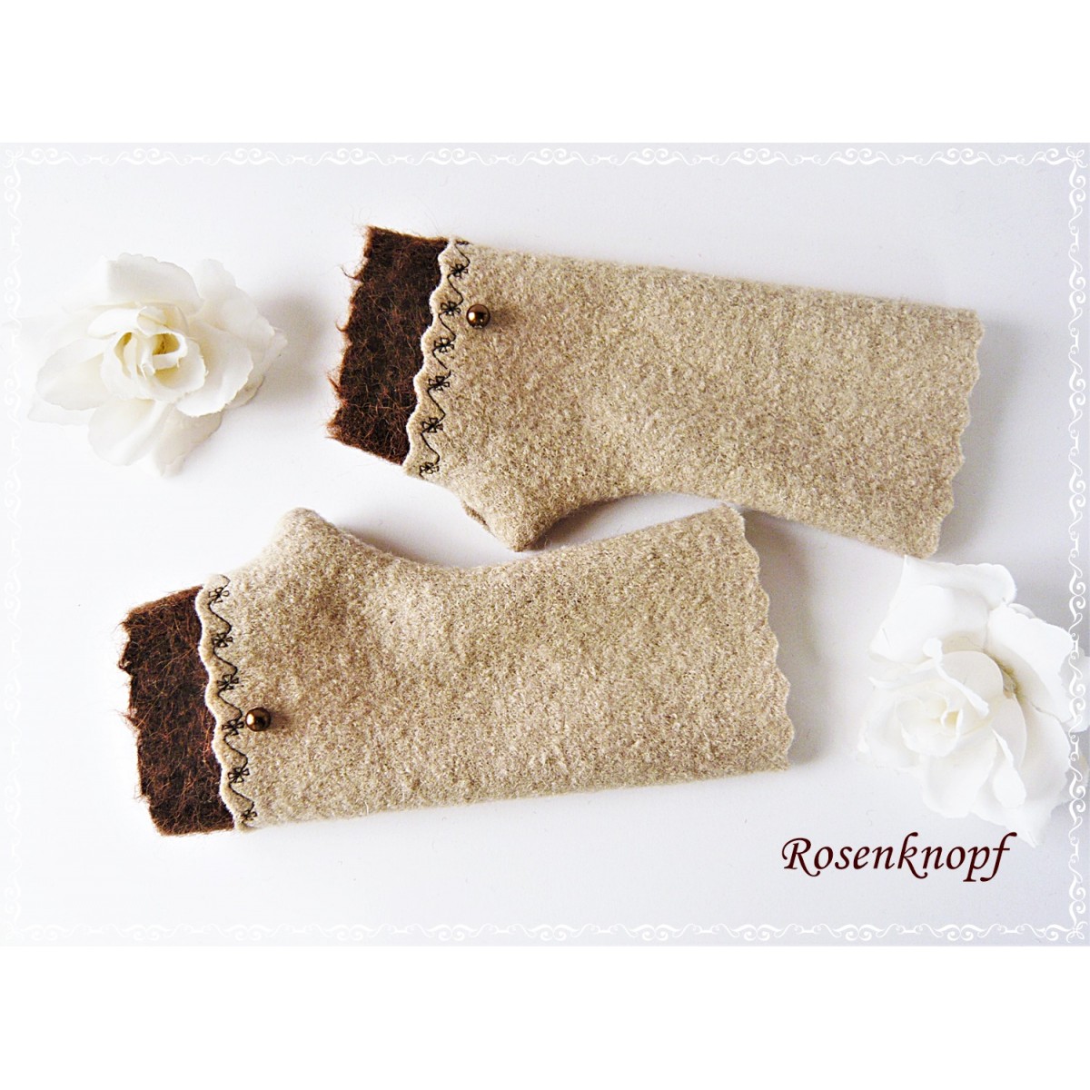 Ansprechende und elegante Damen Pulswärmer/Walkstulpen aus hochwertigem Walk in Sand/Beige mit Daumenloch.