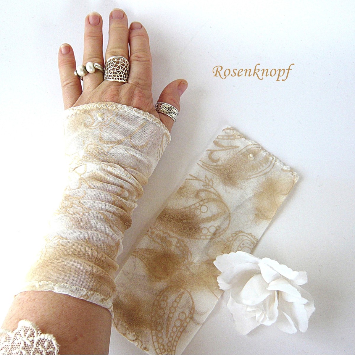 Zeilose und elastische Pulswärmer/Armstulpen aus feinem Tüllstoff in Ivory/Beige gemustert.