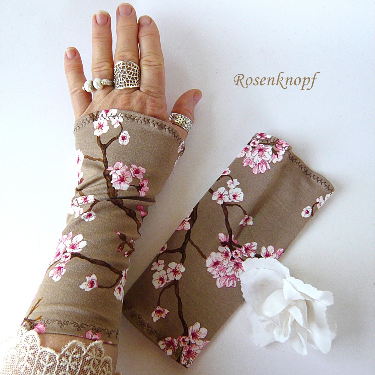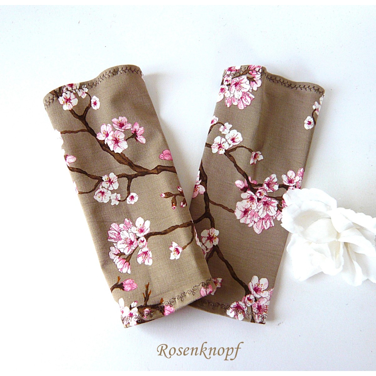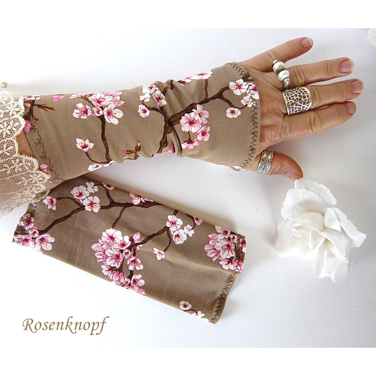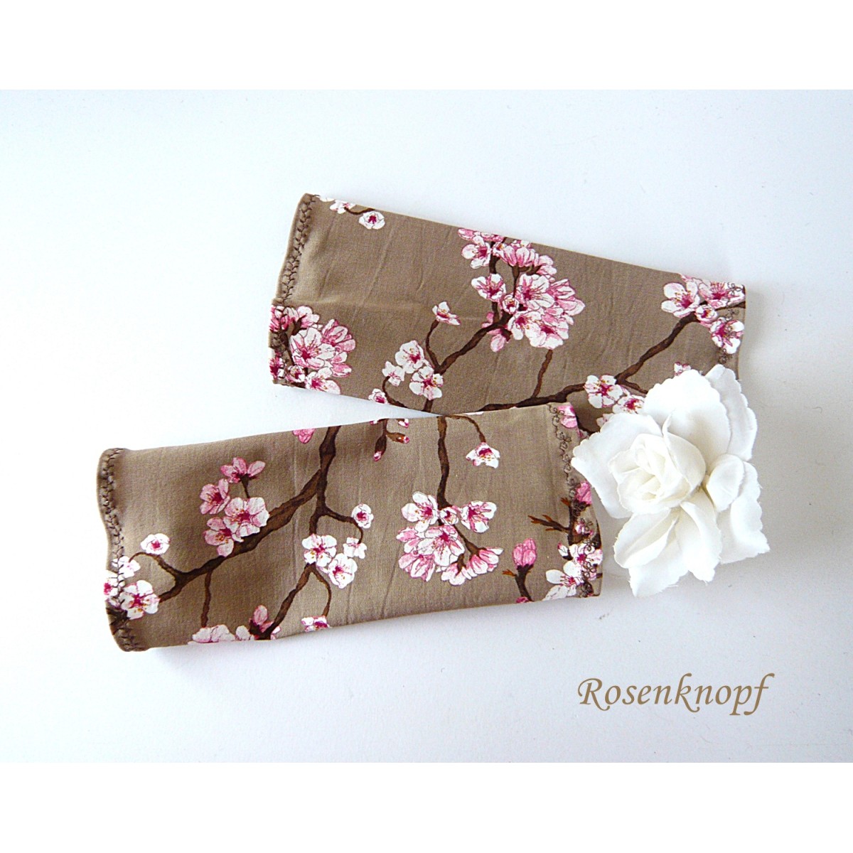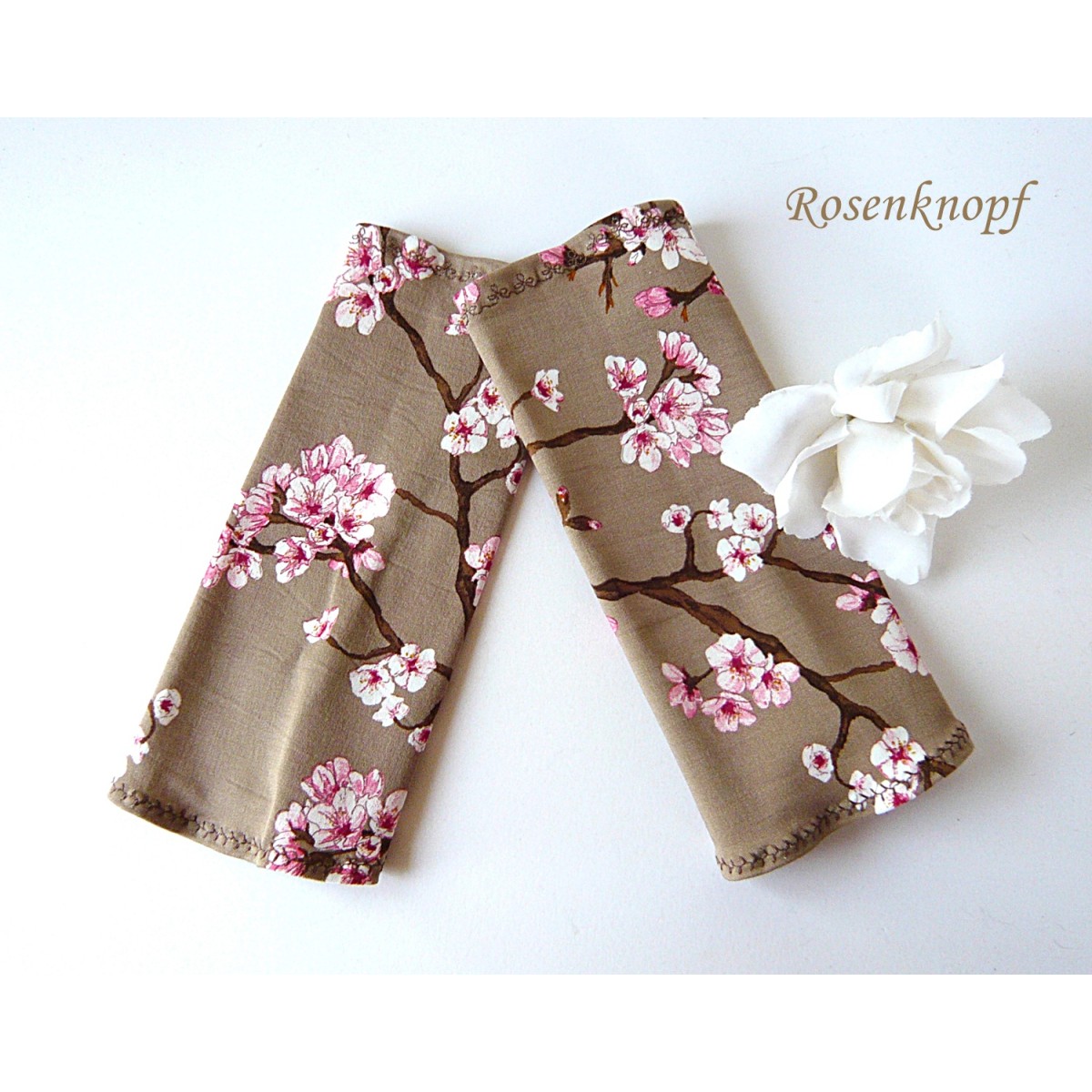 Zeitlose Damen Armstulpen/Pulswärmer aus Baumwollstretch in Nugat, Weiß und Rosa mit ansprechendem Kirschblütenmuster.