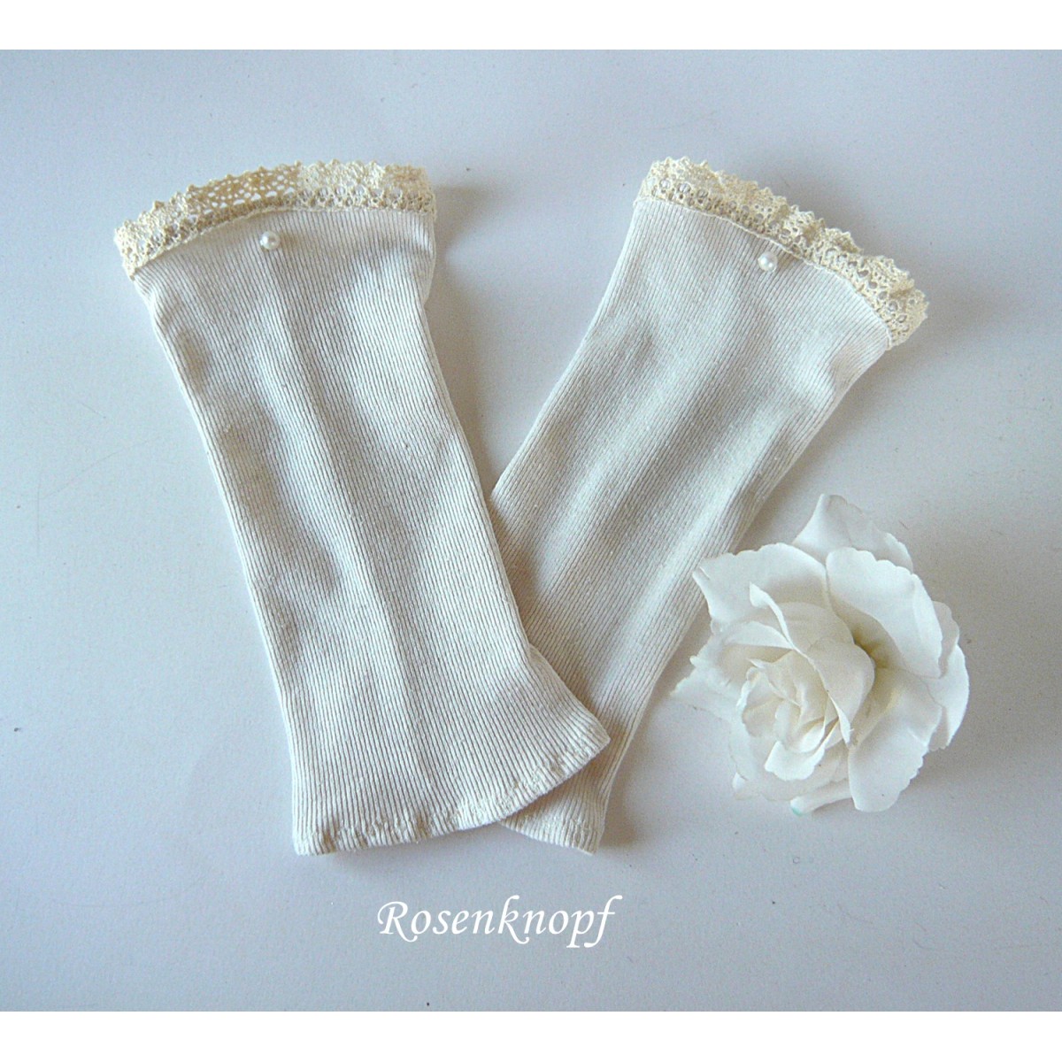 lll➤ Damen Armstulpen/Pulswärmer aus Leinen/Baumwolle in Ivory zur Hochzeit, Standesamt oder Fest mit kleiner Perle.