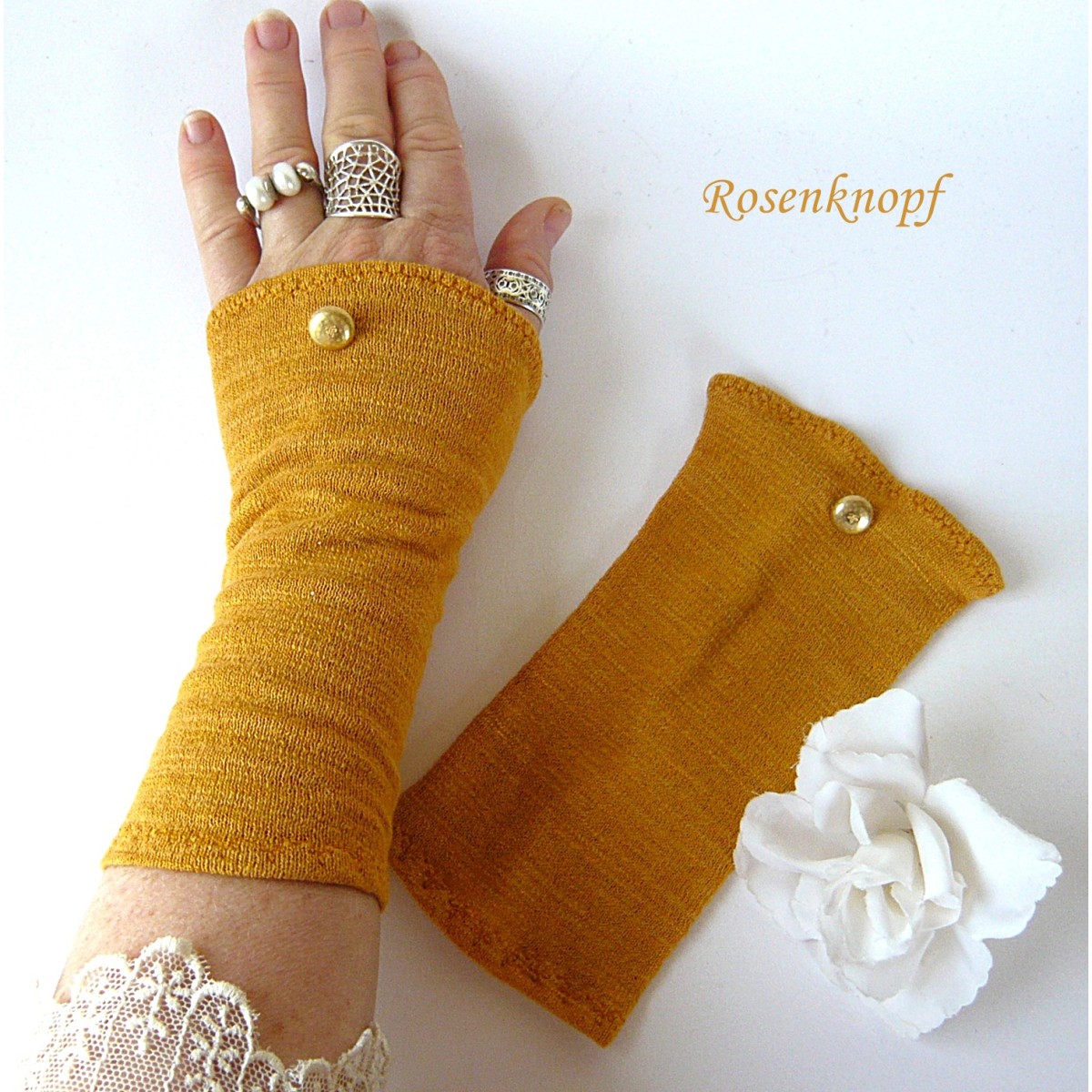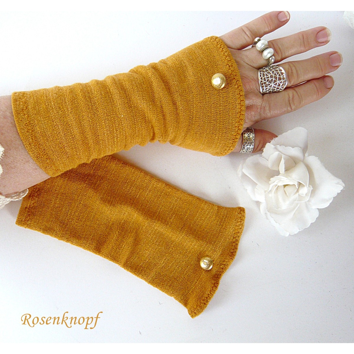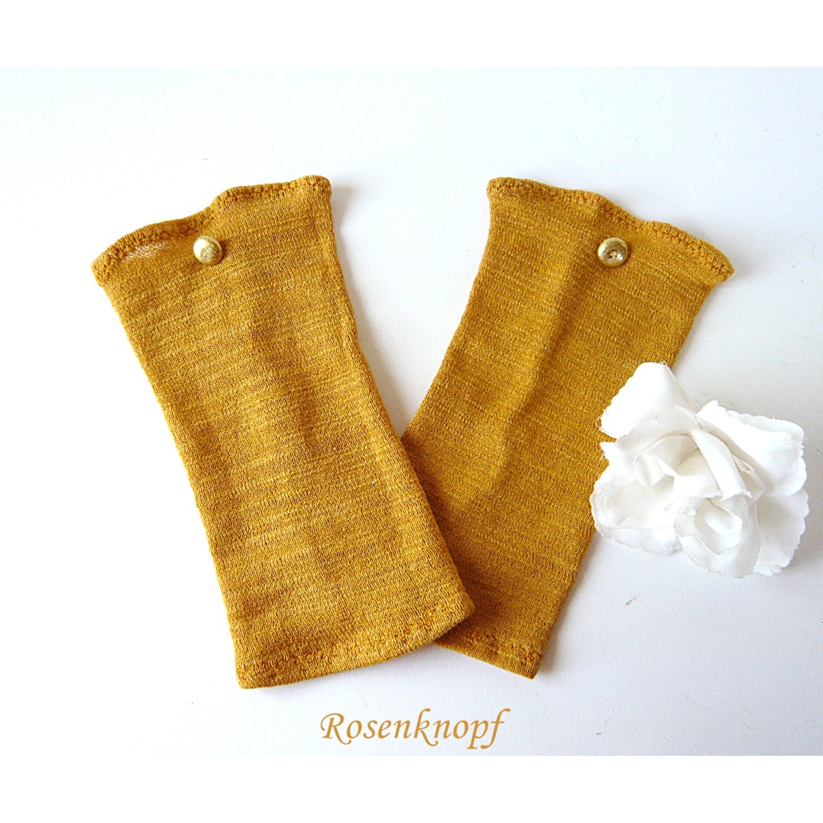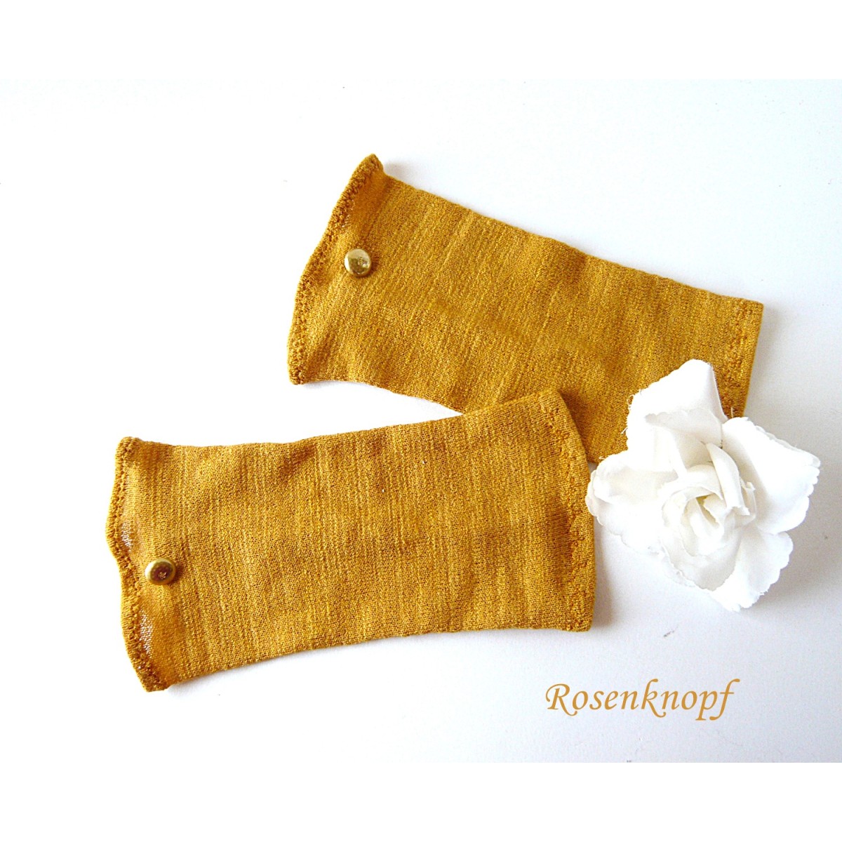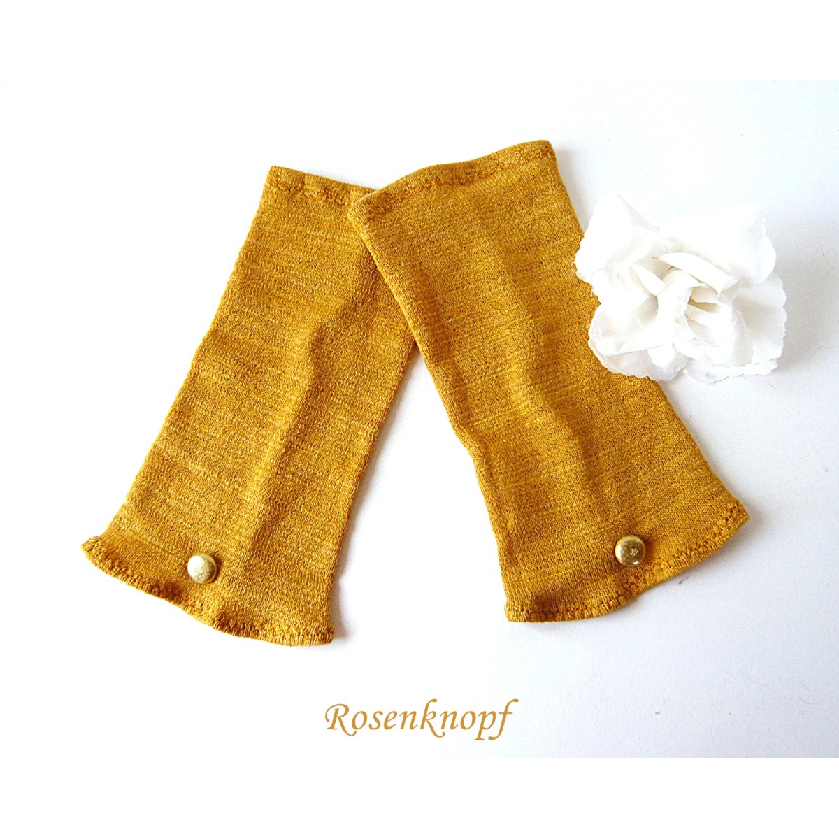 lll➤ Damen Armstulpen/Pulswärmer in Ockergelb mit goldenem Knopf auch zur Hochzeit, Standesamt oder ein Fest.