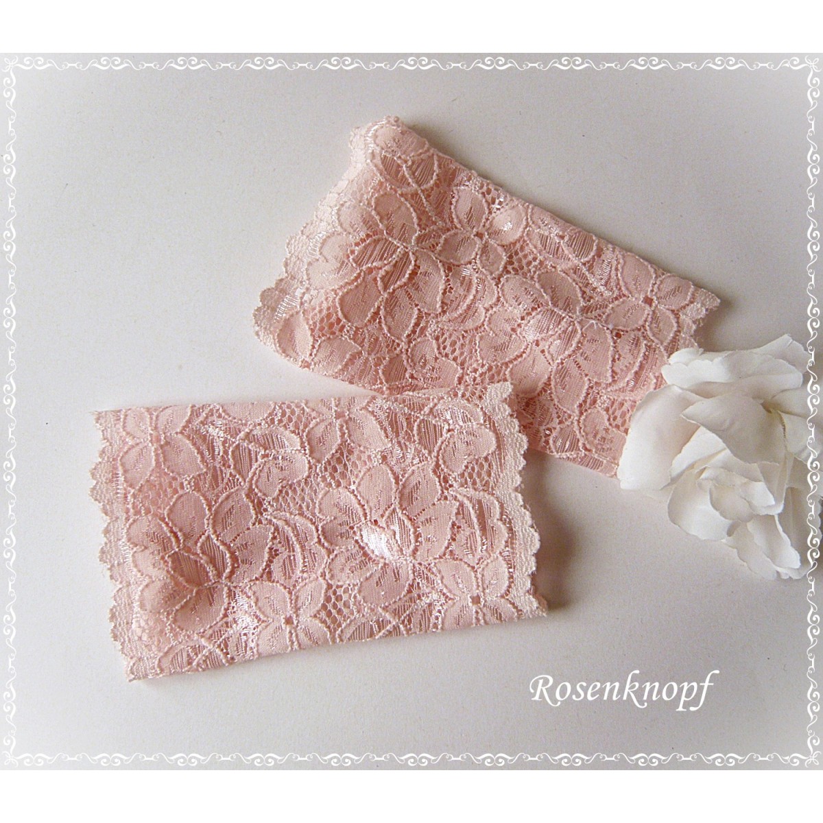 Die Stulpen wurden aus elastischer Spitze mit Seidenglanz gefertigt und enden in weichen Bögen