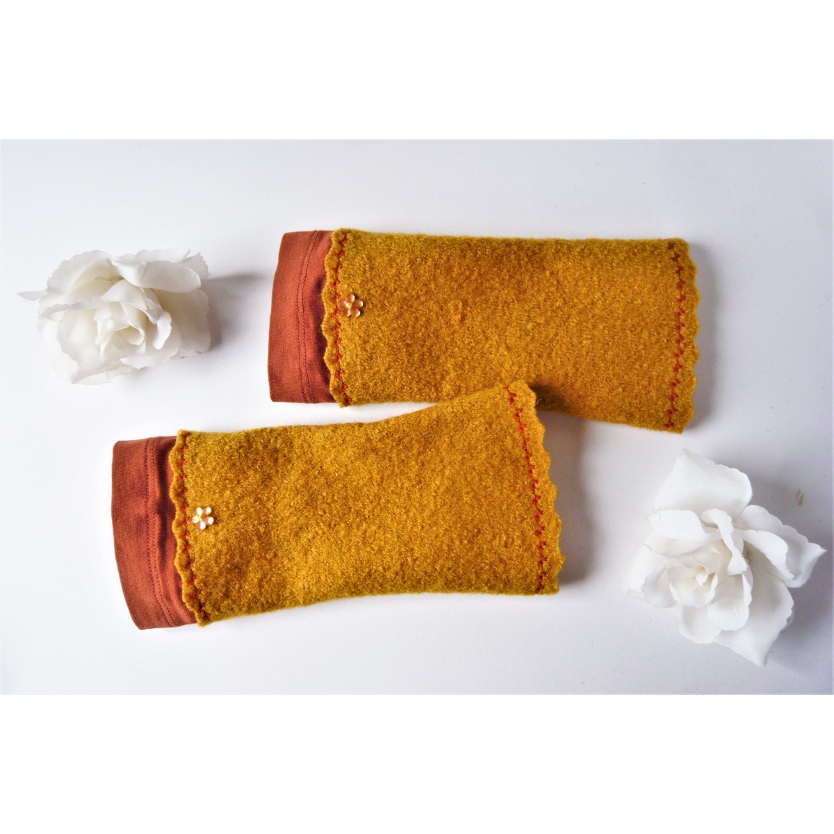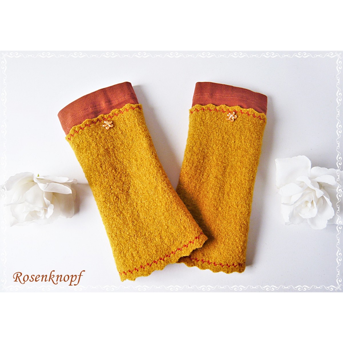 Akzente erhalten die pflegeleichten Damenstulpen durch die Upcycling Stoffblende in Rostbraun und das Blümchen.