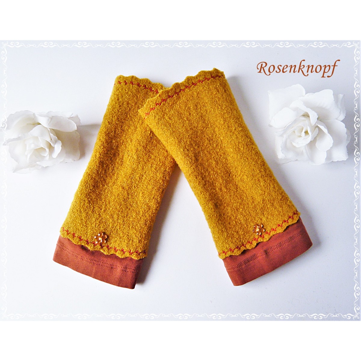Akzente erhalten die Walkstulpen durch die mit Zierstich angesetzte Upcycling Stoffblende in Rehbraun/Rostbraun.