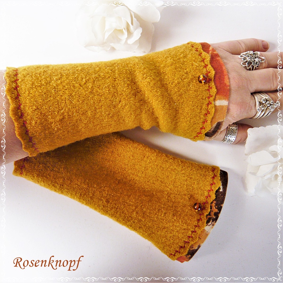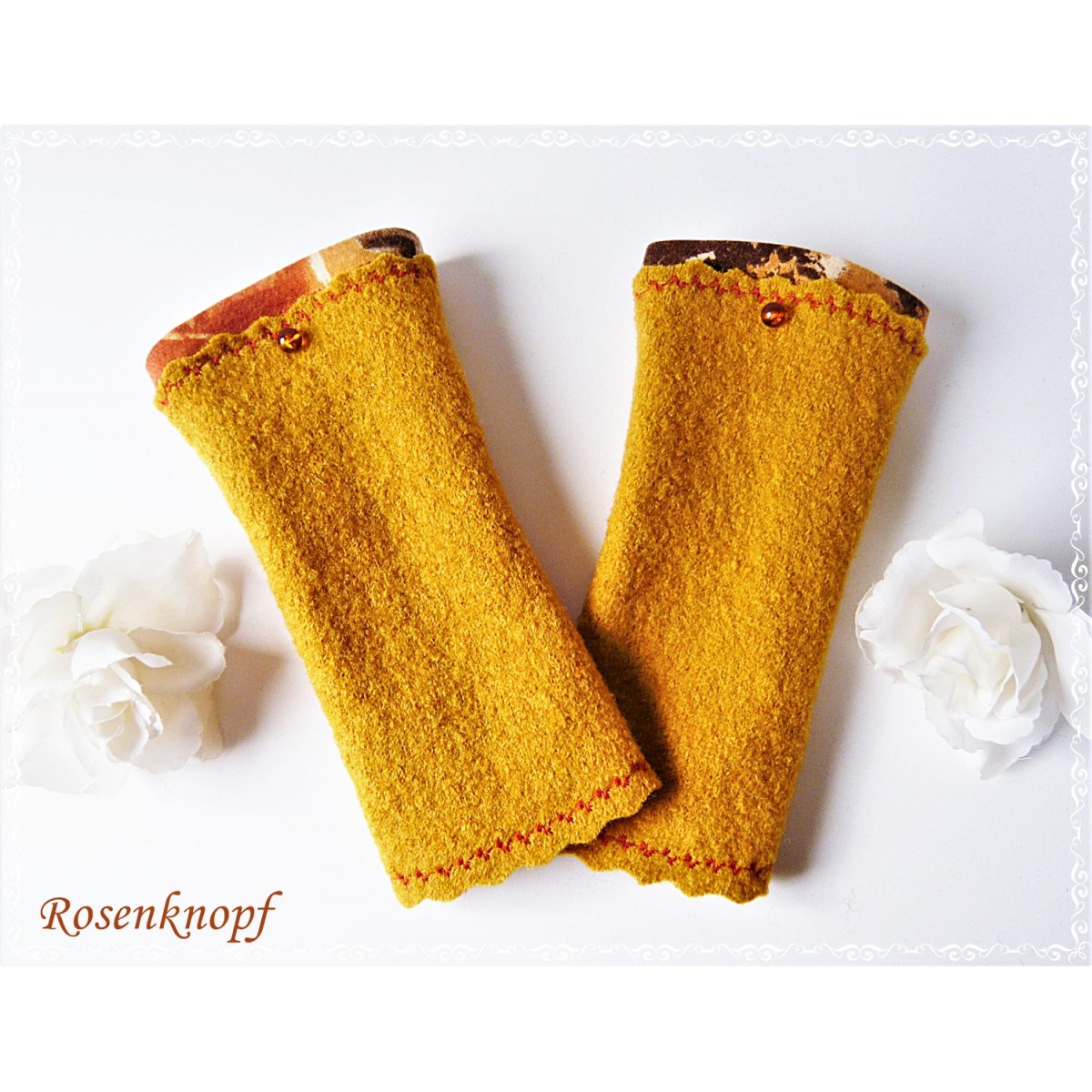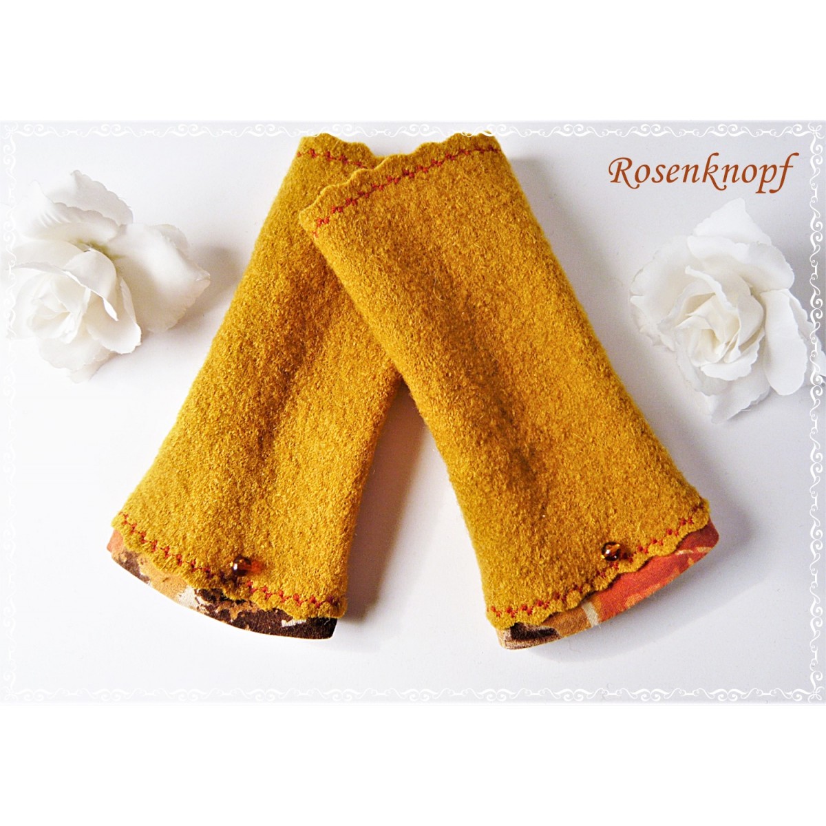 lll➤ Damen Armstulpen, Pulswärmer aus Walk in Ockergelb zur Hochzeit, Standesamt oder ein Fest.