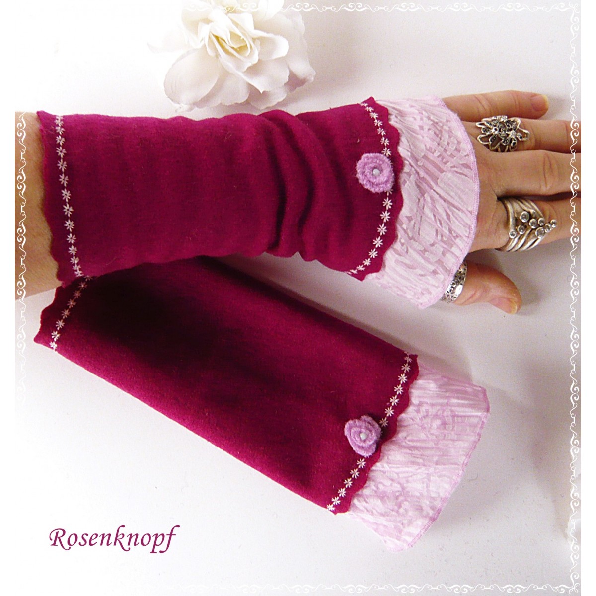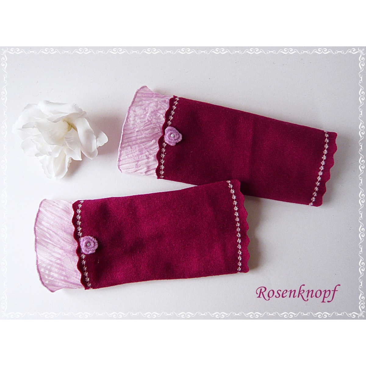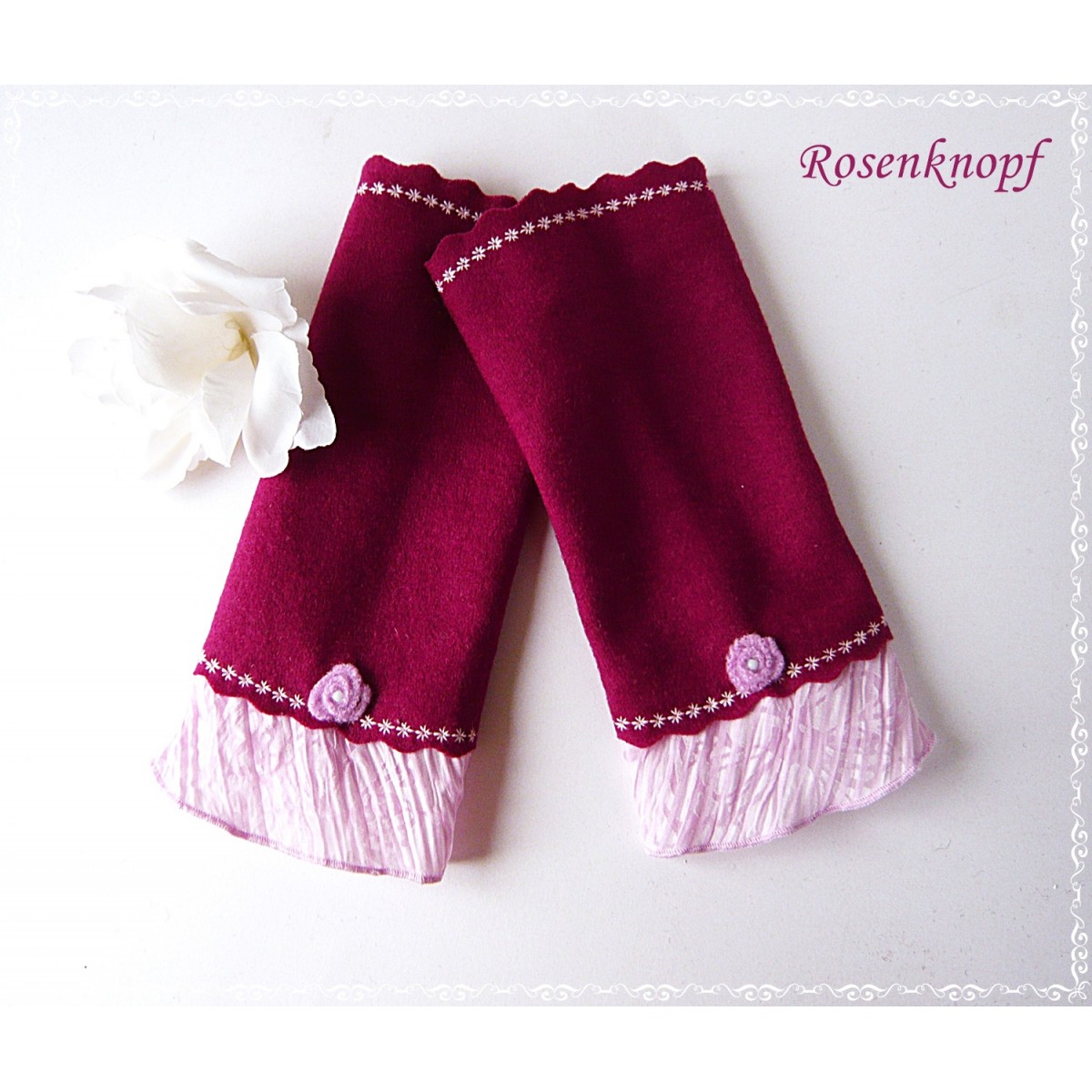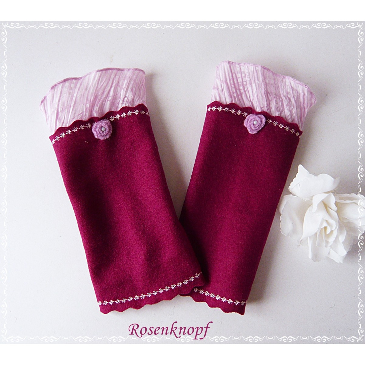Die Wollstulpen ziert eine Stoffblende in Rosa und ein kleines Walkröschen mit Perle.