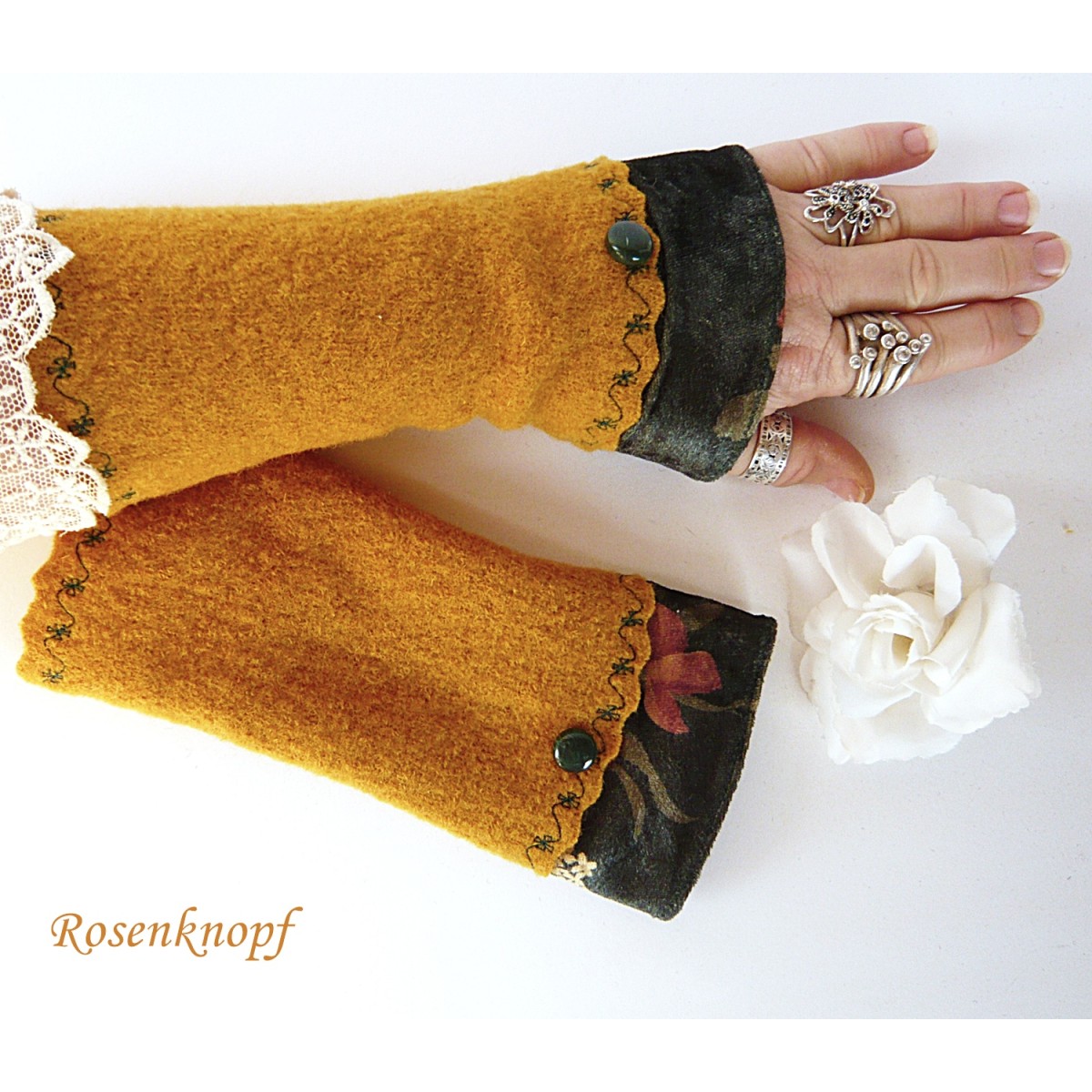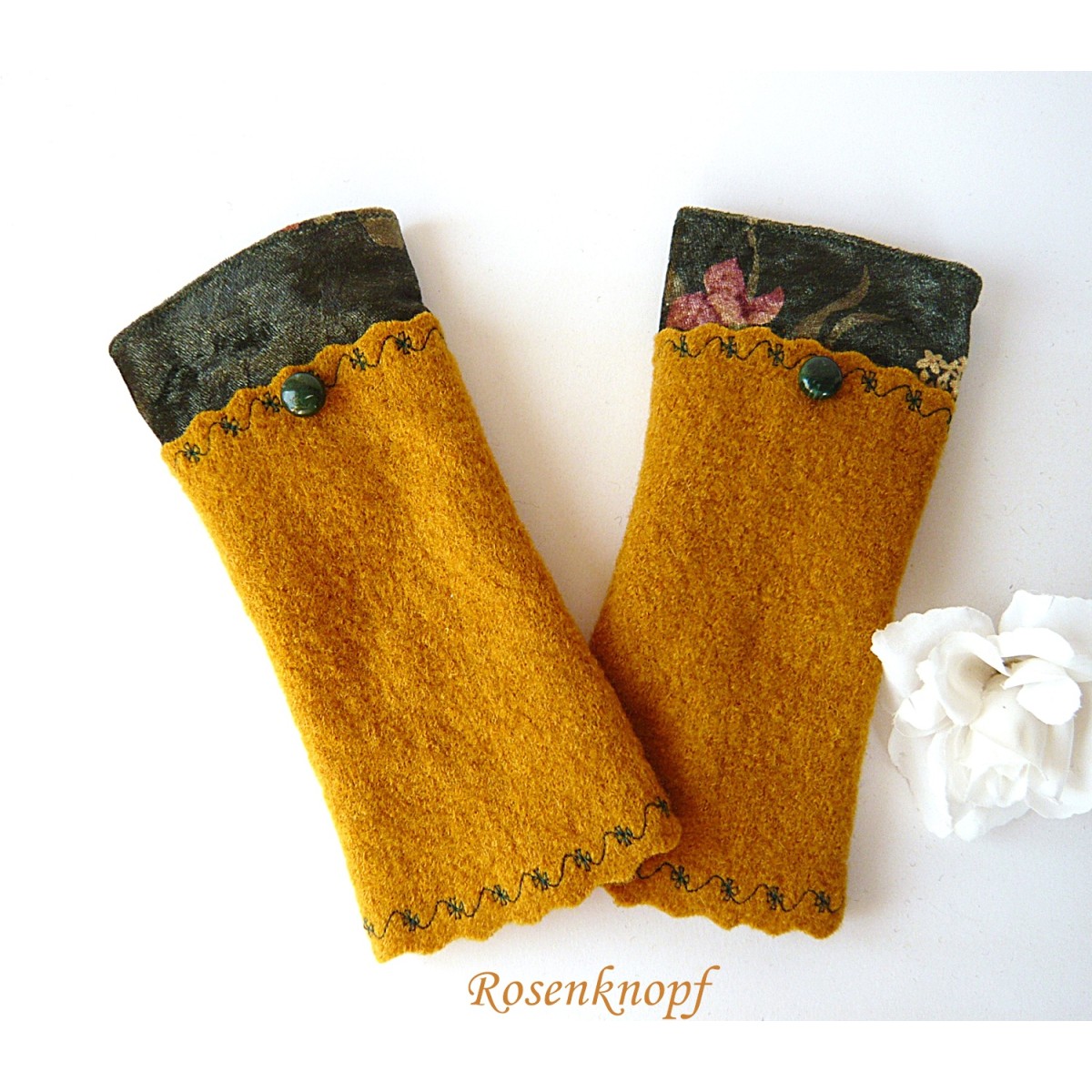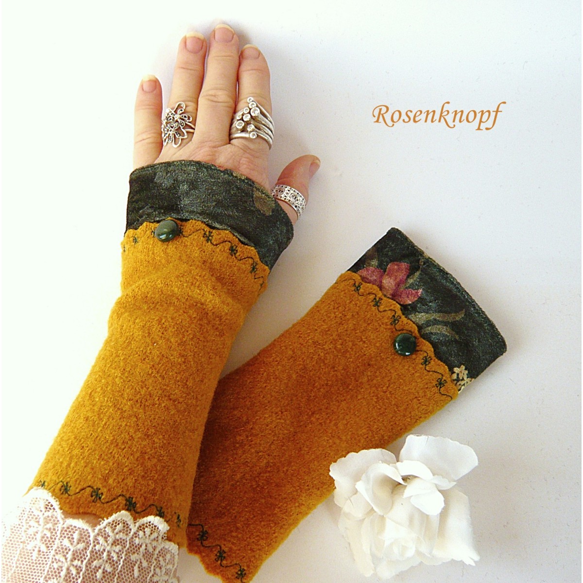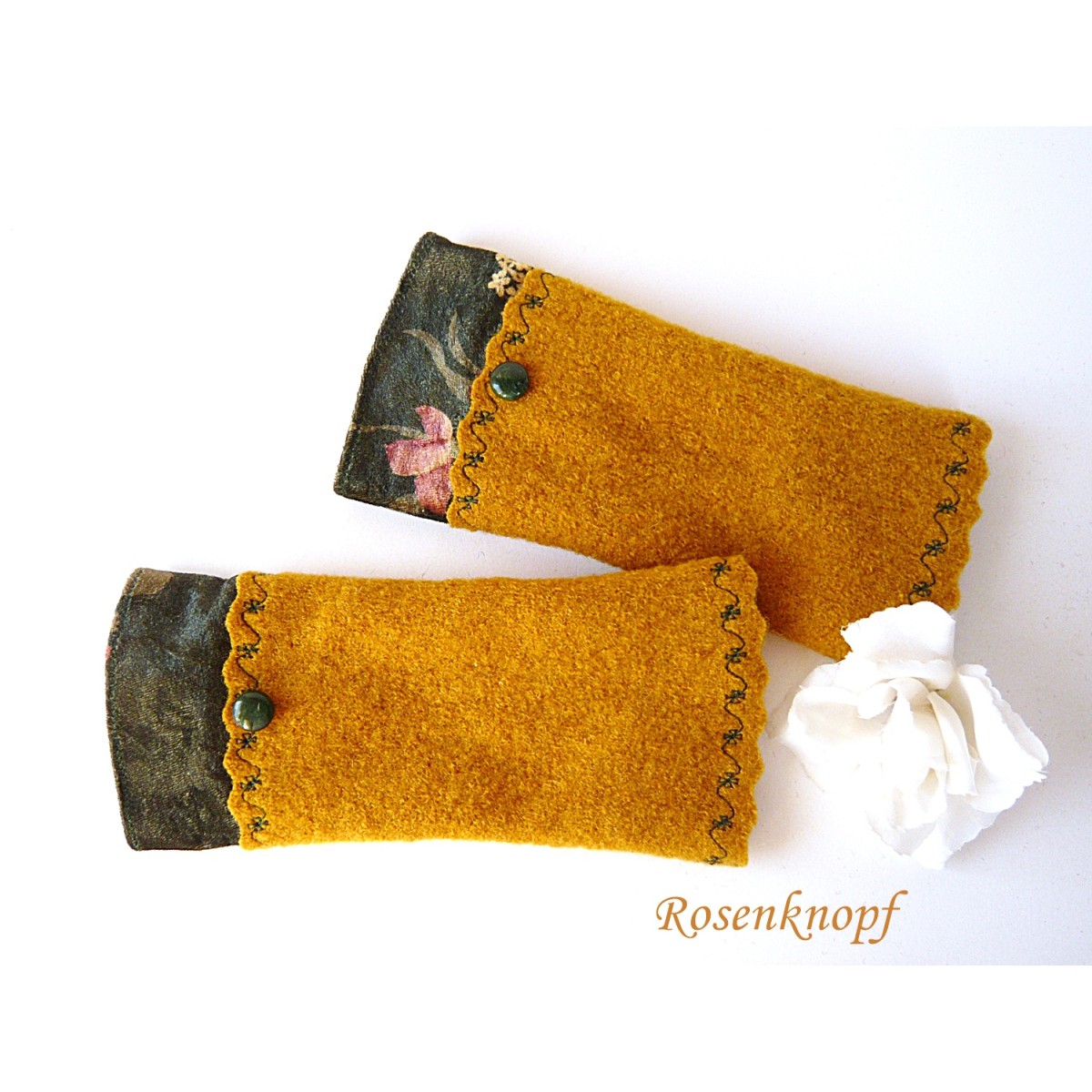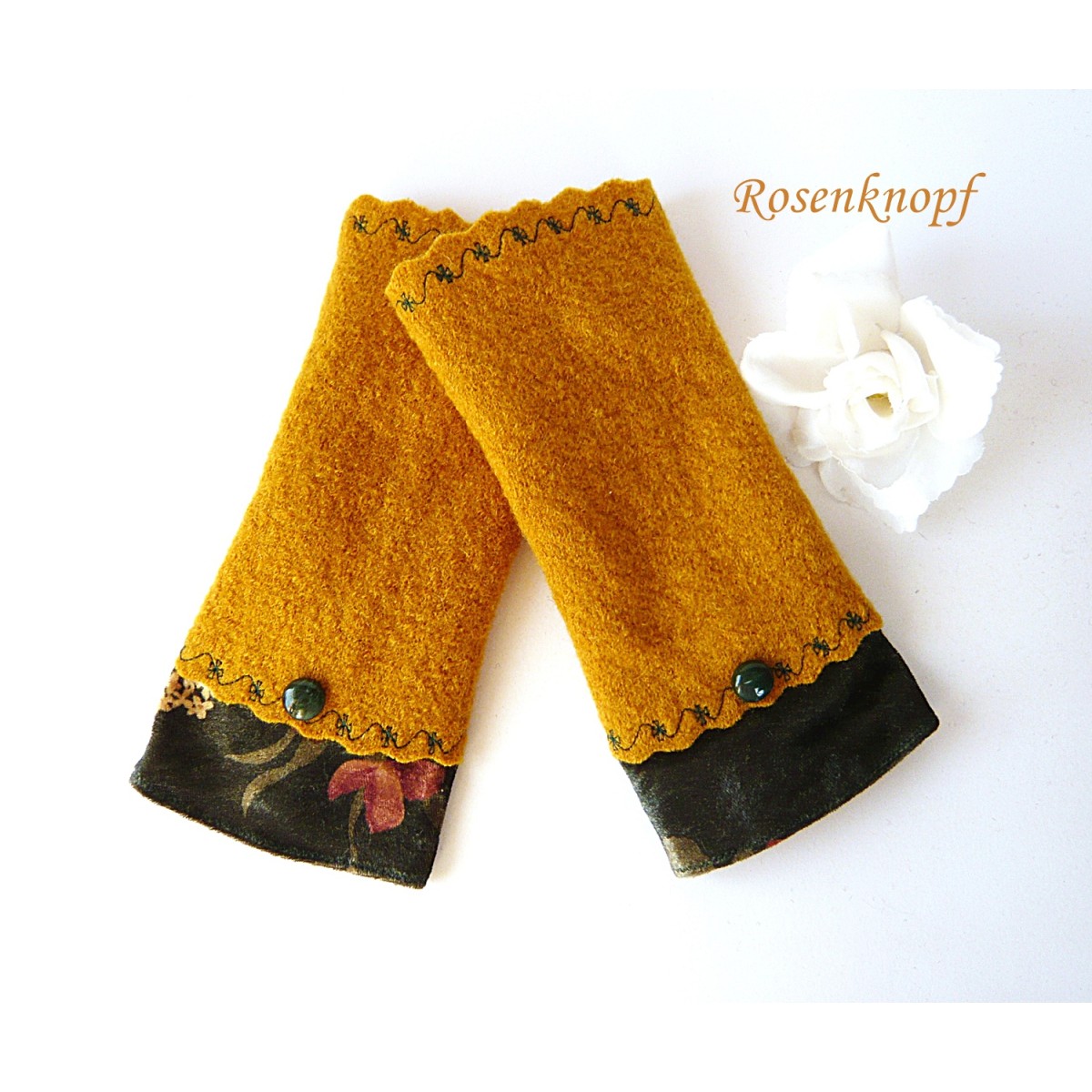 lll➤ Damen Armstulpen, Pulswärmer aus Walk in Ocker zur Hochzeit, Standesamt oder ein Fest.