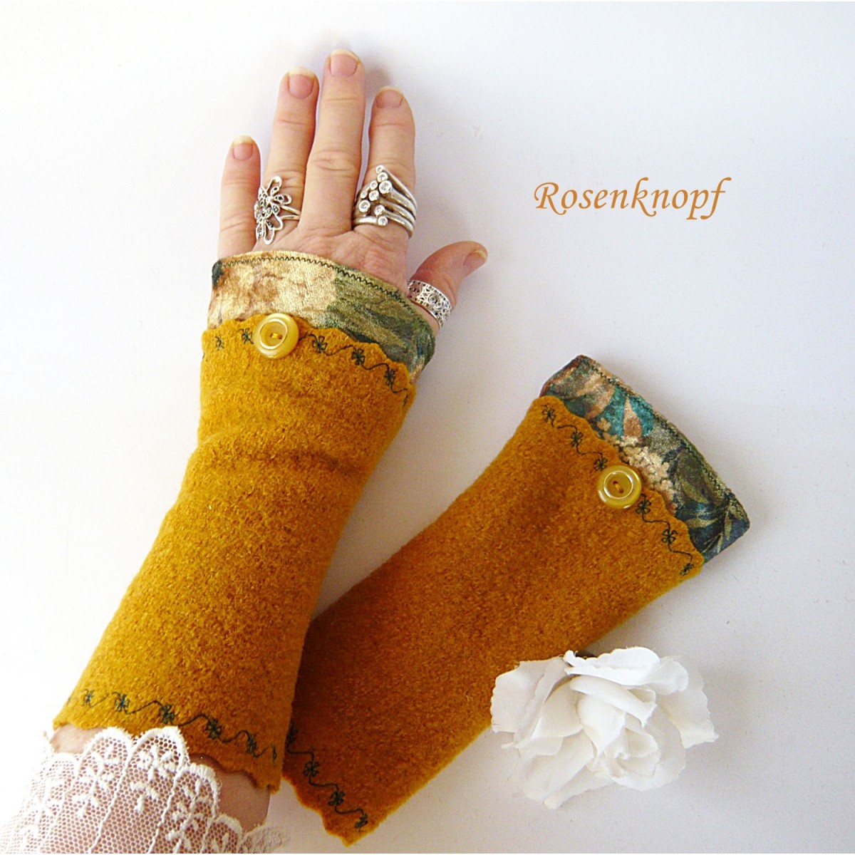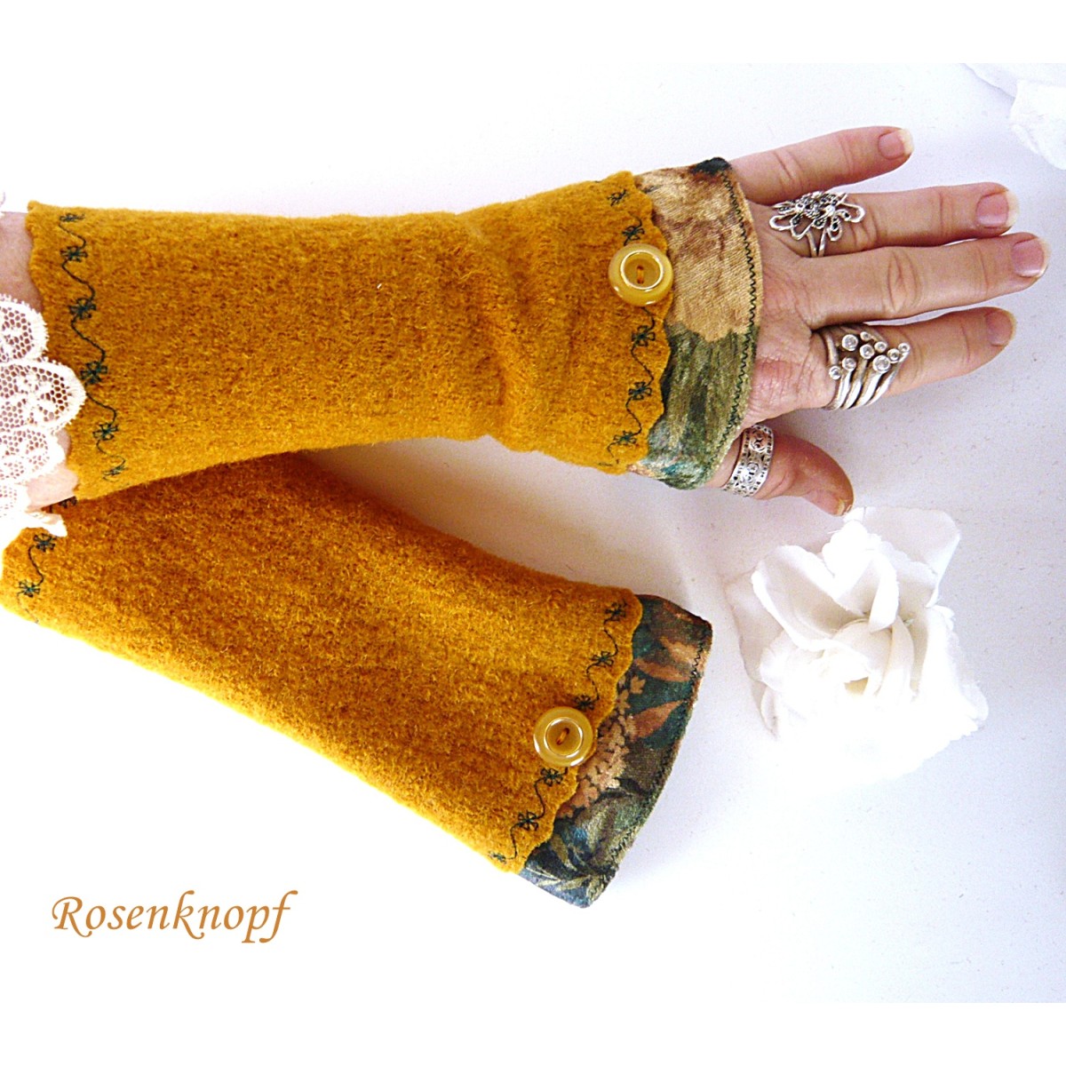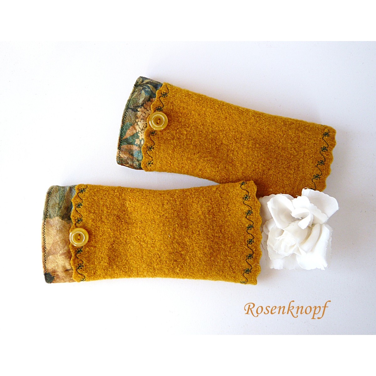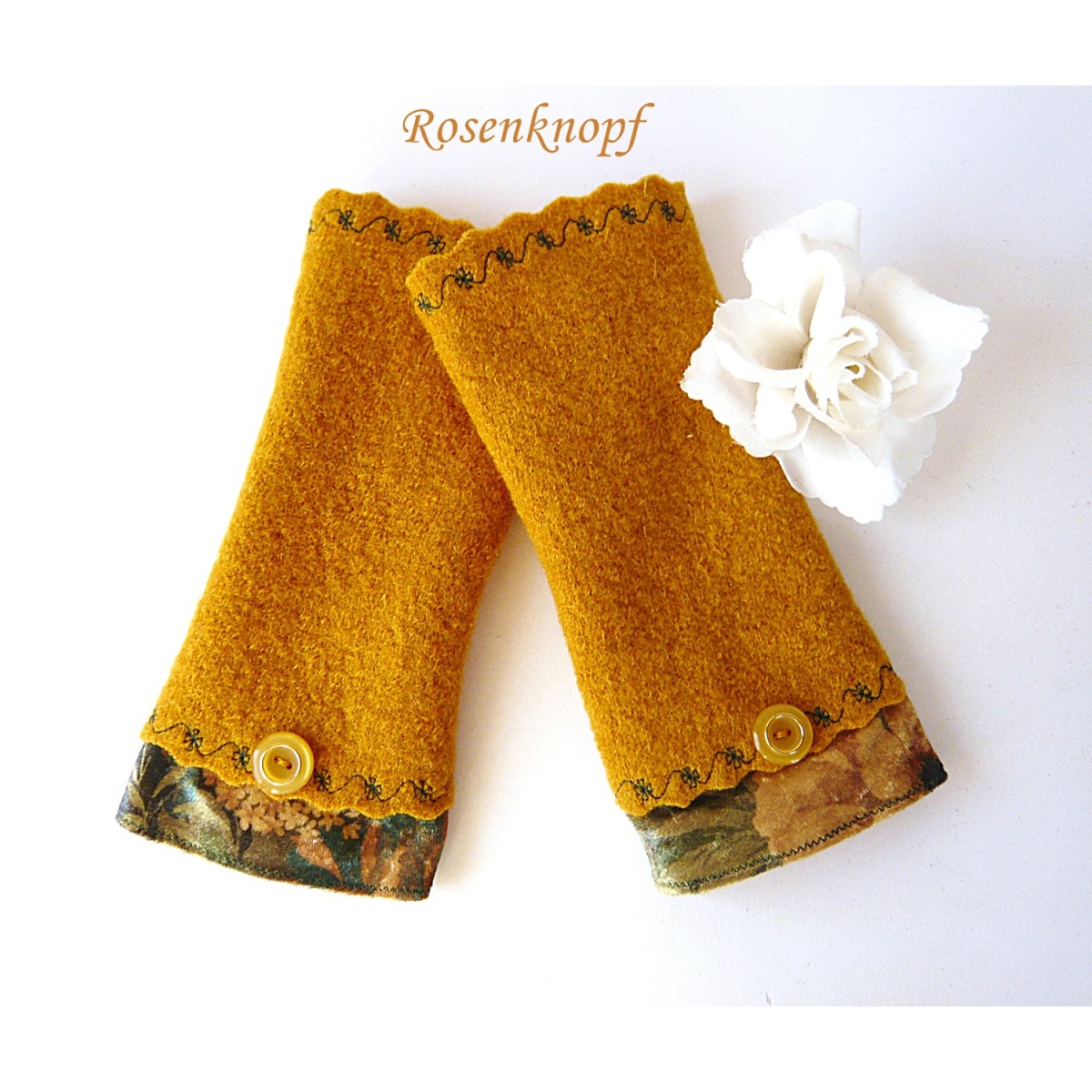 lll➤ Damen Armstulpen, Pulswärmer aus Walk in Ocker zur Hochzeit, Standesamt oder ein Fest.