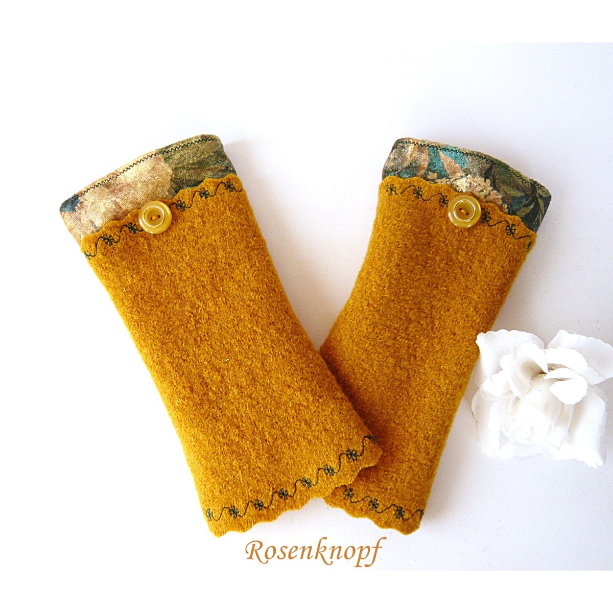 Ansprechende und zeitlose Damen Armstulpen/Pulswärmer aus hochwertigem Walk in Ocker gefertigt wurden.