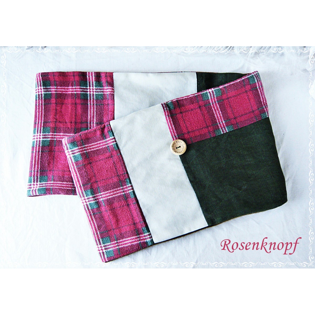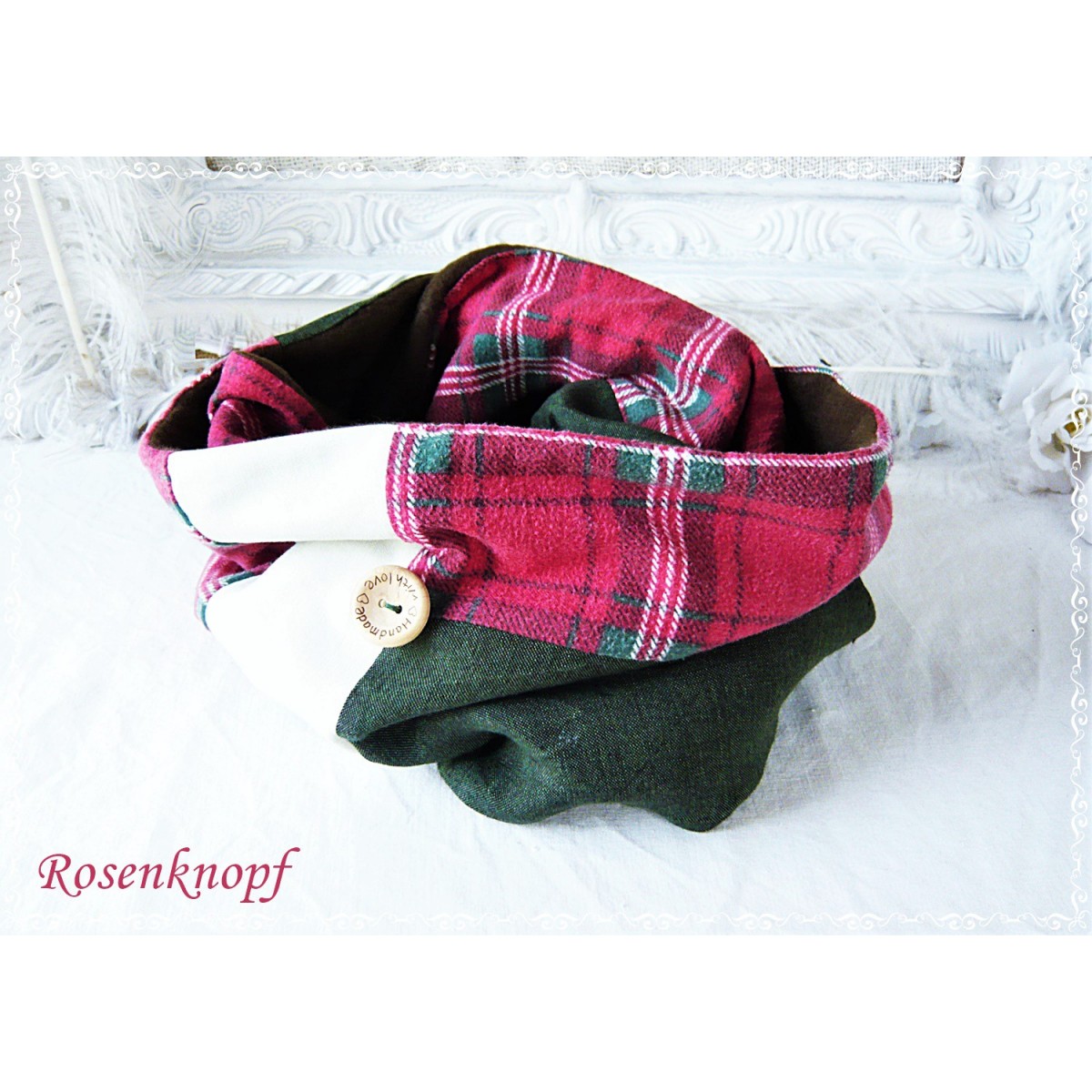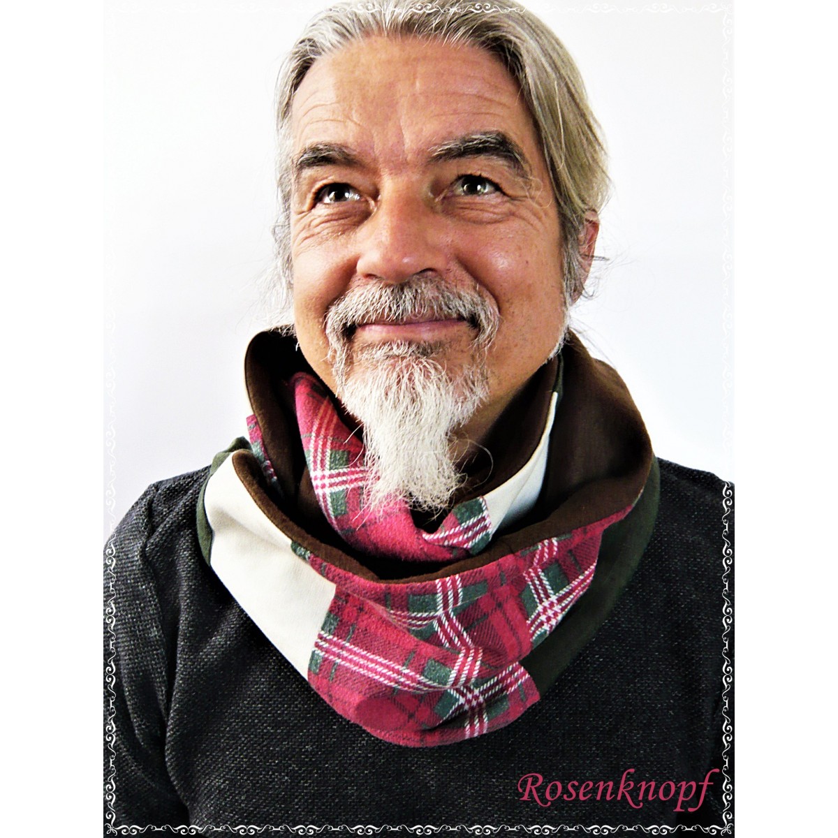 Einzigartiger und alltagstauglicher Schlauchschal für Herren aus verschiedenen Stoffen in Dunkelrot-Grün-Ivory kariert, Dunkelgrün und Ivory, wobei der gemusterte Baumwoll-Flanellstoff eine sportliche Note setzt und bei dem es sich um einen Upcyclingstoff handelt.