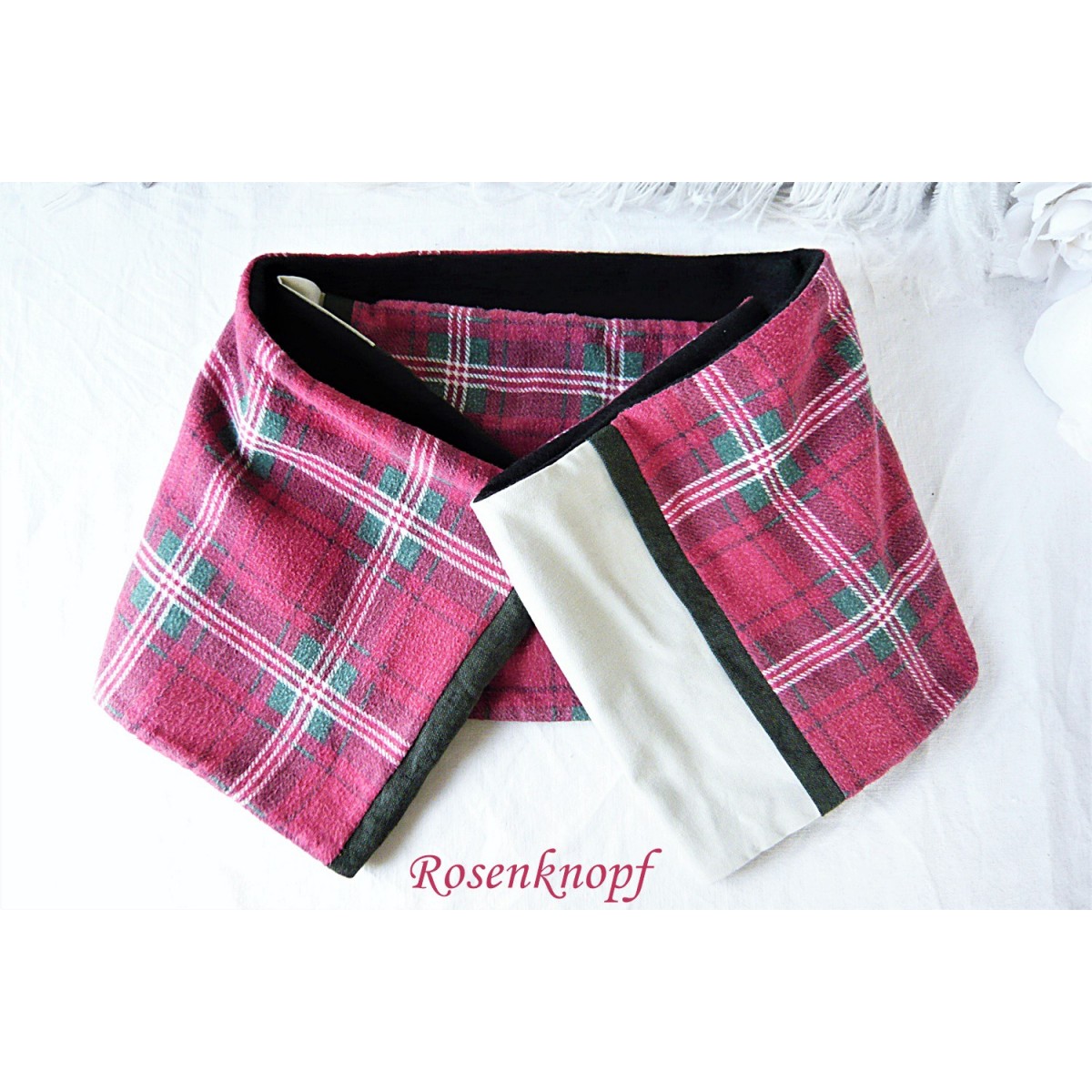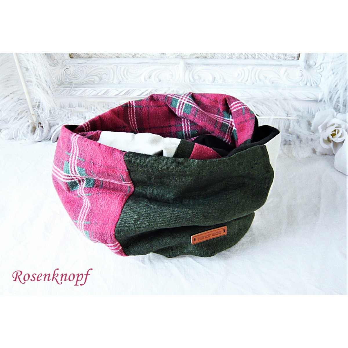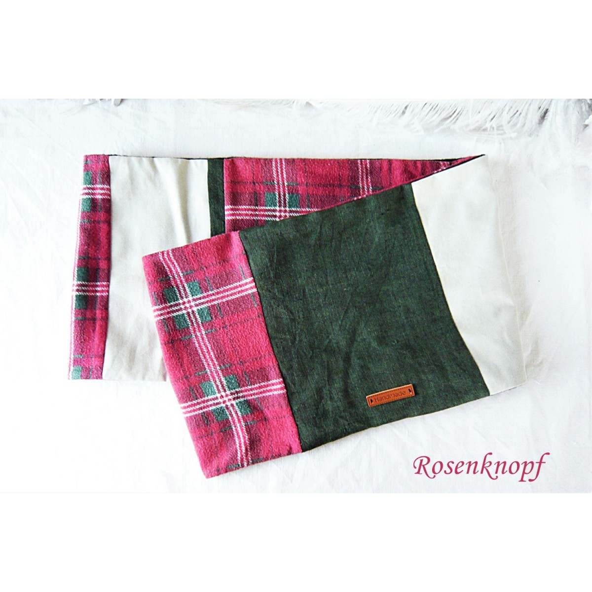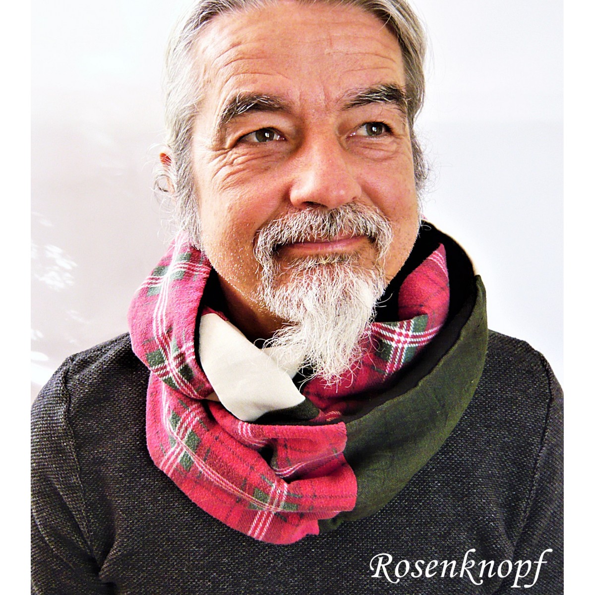 Einzigartiger und alltagstauglicher Schlauchschal für Herren aus verschiedenen Stoffen in Dunkelrot-Grün-Ivory kariert, Dunkelgrün und Ivory, wobei der gemusterte Baumwoll-Flanellstoff eine sportliche Note setzt und bei dem es sich um einen Upcyclingstoff handelt.